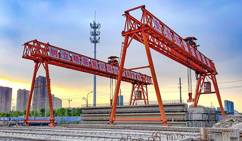 提梁机是一种为桥梁建设而专门设计的一种门式起重机。提梁机既可两台配合抬吊预制梁,也可以单台起重机配双吊具起吊预制梁,两台同时起重的提梁机各自的起重量一般为450吨,单台起重的提梁机起重量通常可达900吨。它配置支腿行走、天车行走及天车起吊设备,可以实现全方位机械化动作。主要用于将预制梁从制梁台提吊至存梁台位,预制梁养护完成后将其从存梁台位吊运到运梁车上。作为起重设备完成架桥机的组装和拆卸。还用于架设墩身不高的旱桥。